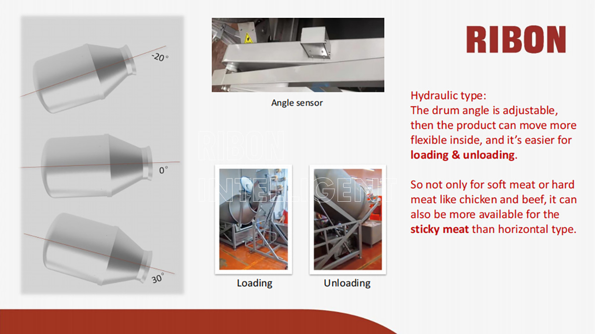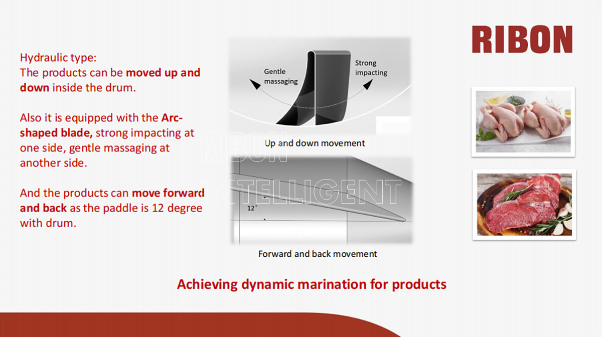 The drum can be adjusted to any tilting angle from 0 to 20 degrees to realize dynamic marination. Inside the drum, the 12-degree inclined arc-shaped carriers, which ensure excellent absorption of marinates.